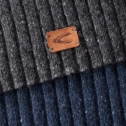 Κασκόλ μπλε-καφέ-γκρι μελανζέ, Camel Active. Διακοσμημένο με δερμάτινο λογότυπο. Από 65% μαλλί, 30% πολυαμίδιο, 5% αλπακά.